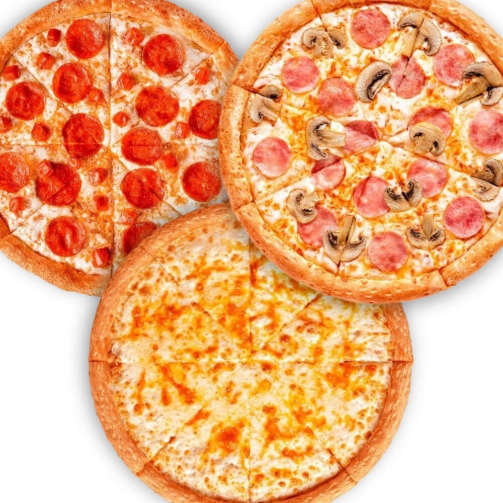 Три вкуснейших пиццы, размер 30 см: Пепперони, Четыре сыра, Ветчина Грибы. Абсолютный хит!