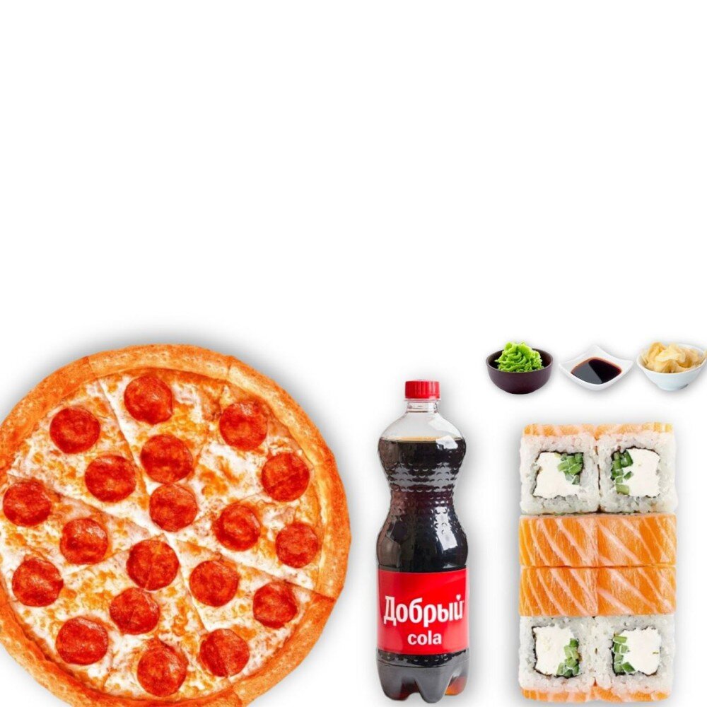 Классическое комбо из вкуснейшей Пепперони, Филадельфии мини (в набор входит 1 соевый соус, 1 имбирь, 1 васаби), напиток 1 л на выбор.
